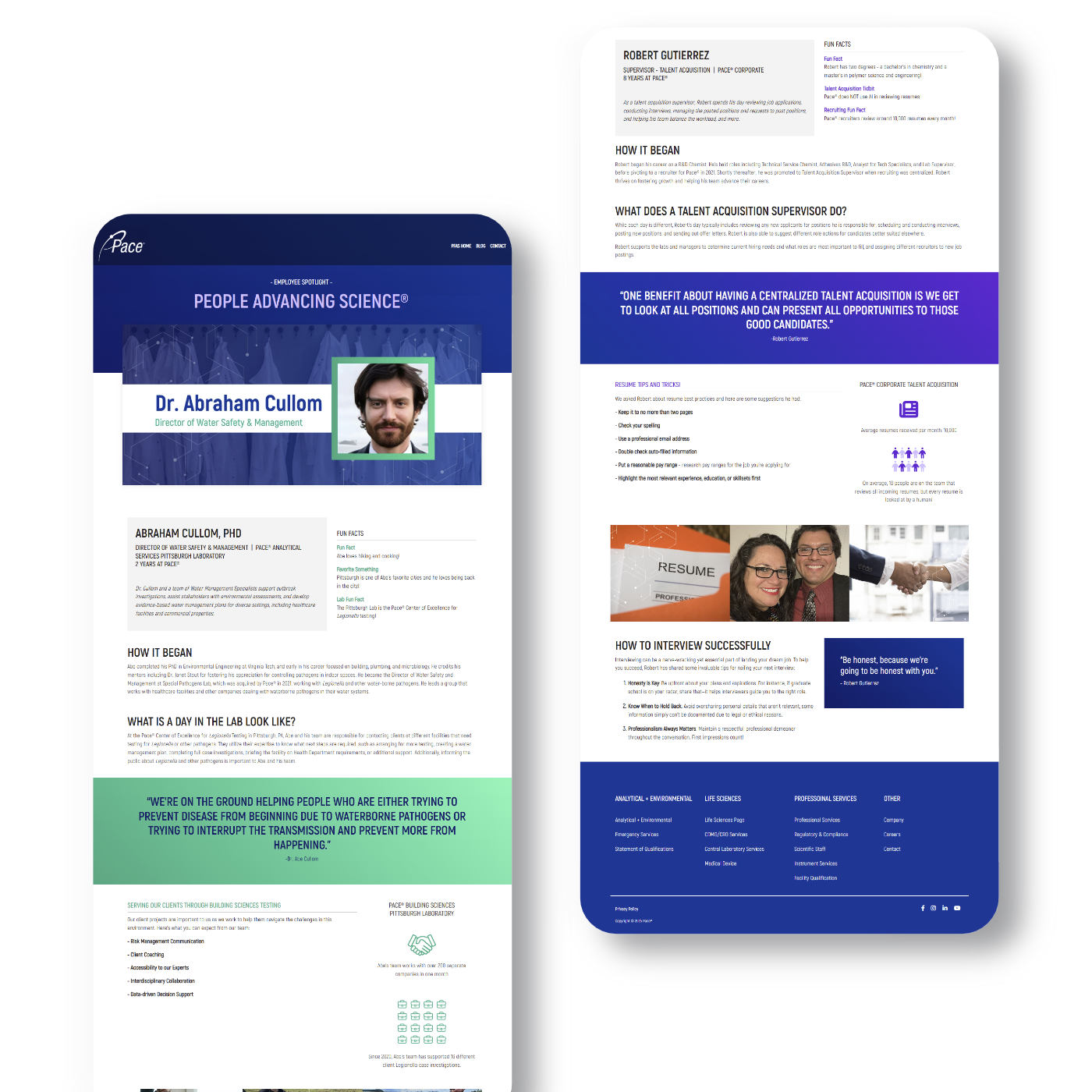 I designed and built several landing pages using HubSpot for my company Pace Analytical. One of the projects were several employee bios, where we highlight the company’s talent and expertise through a day in the life of our team members.